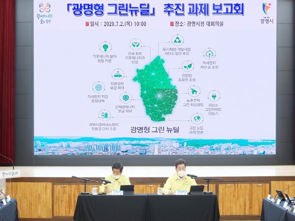 광명시(시장 박승원)는 2일 시청 대회의실에서 모든 간부 공무원들이 참석한 가운데 시장 주재로 ‘광명형 그린뉴딜 추진 과제 보고회’를 열었다.