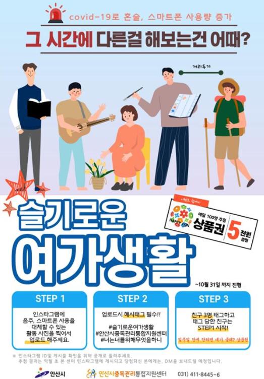 ‘그 시간에 다른걸 해보는 건 어때?’라는 주제로 인스타그램에 음주, 스마트폰 사용을 대체할 수 있는 활동사진을 찍어 ‘#슬기로운여가생활, #안산시중독관리통합지원센터, #너는너를위해무엇을하니’ 등의 해시태그를 달아 업로드하면 된다. 이벤트 참여시 매달 추첨을 통해 100명에게 5천원권 해피포인트 상품권을 증정한다.
