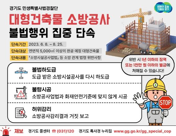 [한국뉴스타임=편집국] 경기도 민생특별사법경찰단이 6월 8일부터 8월 25일까지 도내 신축 대형 건축물을 대상으로 소방 시설 공사 전반에 대한 위법행위를 집중 단속한다.