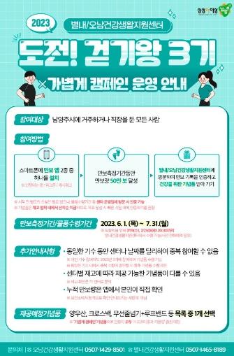 [한국뉴스타임=편집국] 남양주풍양보건소는 1일부터 지역주민을 대상으로 비만 예방에 대한 인식 개선 및 건강생활실천을 도모하고자 기존에 운영하던 만보 걷기 프로그램 ‘도전! 걷기왕’에 더해 ‘가볍게 걷고 마시고 줄이자’라는 주제로 비만 예방 캠페인을 운영한다.