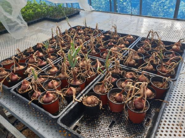 지난해 10월 23일 자색양파를 A사 제품 인공상토에 정식 한 후 무가온 시설에서 12~2월까지 재배하고 이후 야외에서 3월부터 6월 25일까지 재배한 결과에 의하면 양파 지름 5.4~8.5cm, 평균 지름이 7.4cm의 중품정도의 상품이 생산됐다.