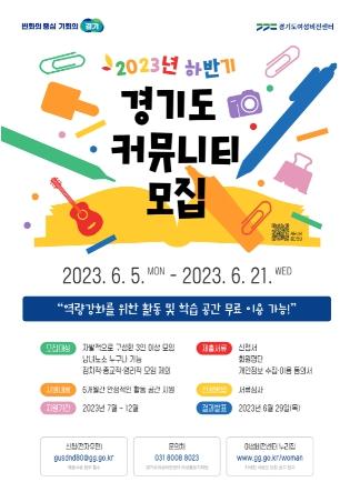 경기도 커뮤니티는 소모임 활동 공간 지원을 통한 자발적 학습 기회 마련과 여성의 사회참여 유도를 위해 시작한 사업으로 모집 대상은 3인 이상 도민 모임이며 남녀노소 누구나 신청할 수 있다.