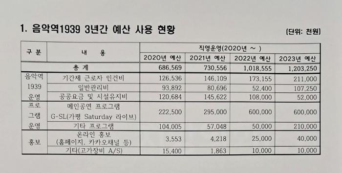 지난 2019년 1월 정식 개장 후 위탁 형태로 운영하는 방식을 수익성 제고 등의 사유로 2020년부터 가평군 직영체제로 운영되고 있는 ‘음악역 1939’에 투입되는 소요예산이 매년 상승하고 있다.