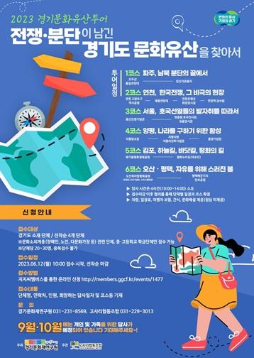 '2023 경기문화유산투어'는 정전협정 70주년을 맞이하여 전쟁의 흔적을 살펴볼 수 있고, 분단의 상황을 실감할 수 있는 ▲파주(오두산통일전망대, 파주 임진각 관광지), ▲연천(연천고랑포구역사공원, 태풍전망대, 연천 유엔군 화장장시설, 연천역 급수탑), ▲양평(지평양조장, 지평의병·지평리전투기념관, 몽양 기념관), ▲김포(애기봉평화생태공원, 평화누리길), ▲오산·평택 등 6개 답사코스로 구성했다.