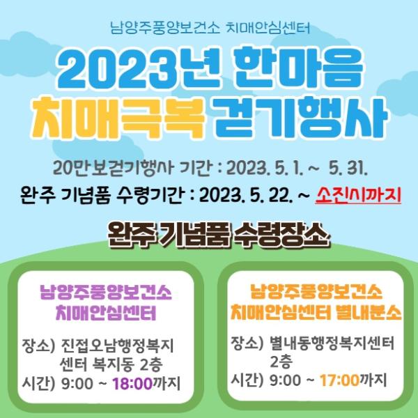 이번 행사는 치매에 대한 경각심을 높이고 부정적 인식을 개선하기 위해 마련됐으며, 남양주 시민 약 300여 명이 한 달간 20만 보를 완주해 남양주풍양보건소 치매안심센터 및 별내분소에서 완주 기념품을 수령했다.