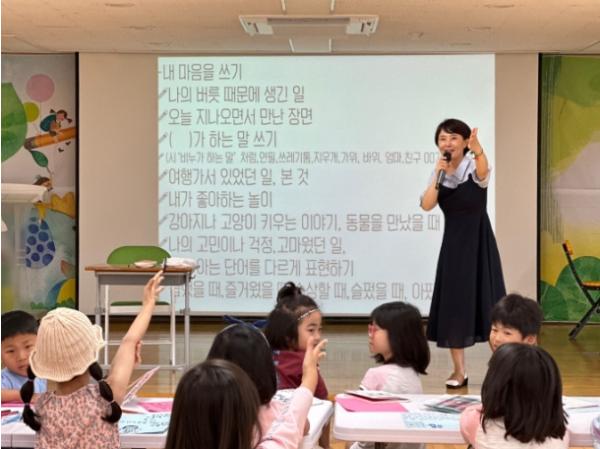 강연의 시작은 김미희 작가의 시를 노래로 표현한 ‘곰곰’, ‘귤송’을 함께 따라 부르며 문을 열었으며 작가가 쓴 시의 일부를 보여주고 제목을 맞추며 동시의 재미와 시를 쓰는 기쁨을 느꼈다. 이후 자신이 좋아하는 관심사, 주제를 떠올리며 동시를 직접 지어보는 미니 백일장을 열었다. 저마다 매일 보는 물건이라도 관점을 바꾸며 시를 지으니 참신한 이야기들이 쏟아졌다.