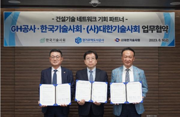 경기주택도시공사(GH)가 한국기술사회, (사)대한기술사회와 9일 오후 GH 본사에서 건설기술 네트워크 기회파트너 업무협약(MOU)을 체결했다.