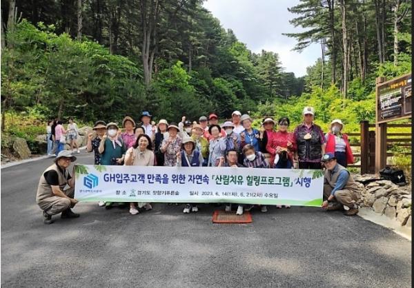 경기주택도시공사(GH)는 14일 경기도 잣향기푸른숲(가평 소재)에서 공공임대주택 독거노인 및 고령자 입주민을 대상으로 산림치유 힐링캠프 체험행사를 시행했다.