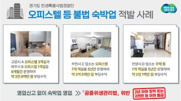 경기도 특별사법경찰단은 지난 5월 15일부터 26일까지 수원, 부천, 성남, 고양 등 11개 지역에서 불법영업으로 의심되는 숙박업소에 대한 단속을 벌여 미신고 영업 36곳 103개 객실을 적발했다고 15일 밝혔다.