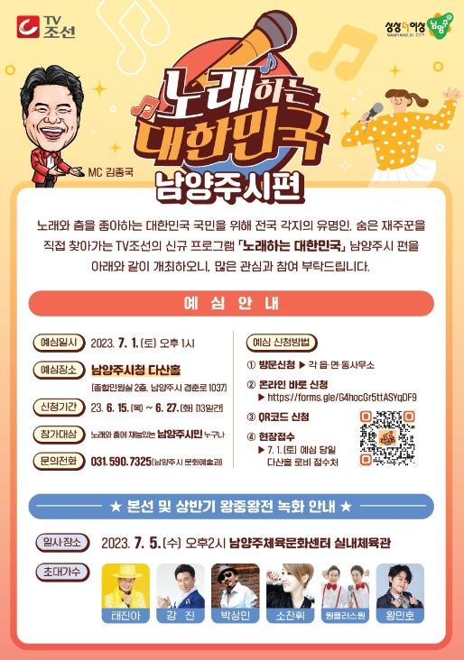 오는 7월 5일 오후 2시 남양주체육문화센터 실내체육관에서는 ‘노래하는 대한민국 남양주시편’ 본선과 2023년 상반기 왕중왕전이 연이어 진행되며, 태진아, 강진, 박상민, 소찬휘, 원플러스원(이병철, 김민교), 황민호가 초대 가수로 출연한다.
