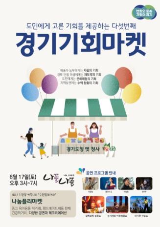 [한국뉴스타임=편집국] 경기도가 도청사 이전으로 위축된 구청사 주변 상권을 활성화하기 위해 민간 유명 벼룩시장과 손잡고 여는 다섯 번째 ‘경기기회마켓’을 17일 수원시 팔달구 경기도청 구청사에서 개최한다.