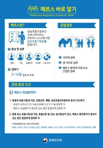 김범호 경기도보건환경연구원 감염병연구부장은 “해외여행 후 발열 또는 호흡기 증상이 있다면 감염 전파 방지를 위해 외출을 자제하고 의료기관 방문 전에 질병관리청 콜센터 1339번에 연락해 상담받는 것을 권유한다”라며 “중동지역을 경유 또는 방문할 계획이 있다면 질병관리청 누리집 알림?자료에서 ‘메르스 바로알기 및 여행자 감염예방 수칙 안내 홍보물’을 확인하기를 바란다”고 당부했다.