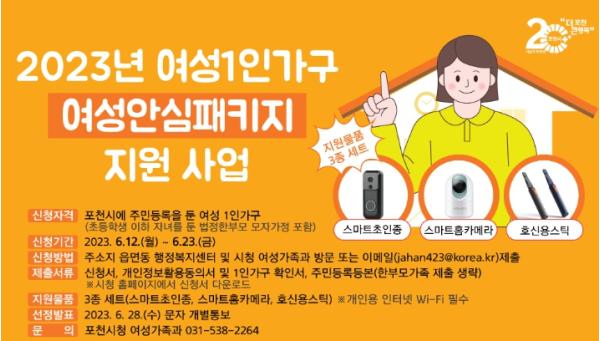 [한국뉴스타임=편집국] 포천시는 범죄 대응능력이 취약한 여성 1인가구에 방범 안심패키지 물품을 보급해 여성의 안전한 일상을 돕기 위한 여성 안심패키지 지원사업을 시행한다고 밝혔다.