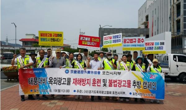 이날 행사에서 (사)경기도옥외광고협회 포천시지부(지부장 최영춘) 임원과 회원, 포천시청 관계자 등 20여 명이 참석해, 풍수해로 인한 옥외광고물 추락 등 안전사고를 방지하기 위한 안전점검과 불법광고물 추방에 대한 홍보를 펼쳤다.