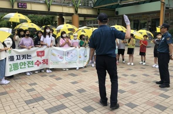 이날 캠페인에서는 청학초등학교 학생들에게 △무단 횡단 절대 안 하기 △보행 중 스마트폰 사용 안 하기 △횡단보도 건널 때 좌우 살피기 등 교통안전 수칙을 안내하고, 홍보 물품으로 제작된 어린이 안전 우산 100여 개를 배부했다.
