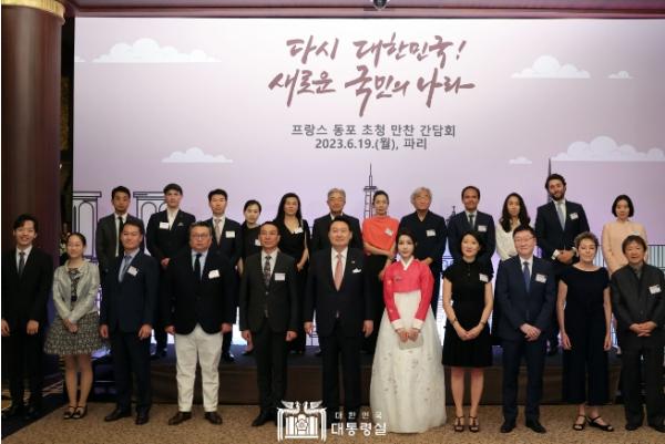 [한국뉴스타임=편집국] 프랑스를 방문 중인 윤석열 대통령은 김건희 여사와 함께 6.19일 현지 동포를 초청하여 만찬을 겸한 간담회를 가졌다. 이번 간담회에는 한-불 다문화 가정 동포, 입양 동포를 포함하여 각계 각층에서 활약 중인 동포 100여 명이 참석했다.