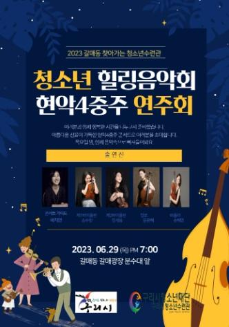 구리시청소년재단(대표이사 강종일) 청소년수련관은 오는 6월 29일 갈매동 갈매광장 분수대 앞에서 찾아가는 문화행사인 ‘청소년 힐링음악회’를 운영한다.