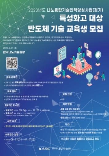 [한국뉴스타임=편집국] 경기도와 한국나노기술원이 도내 특성화고 3학년을 대상으로 2023년도 반도체 기술 교육생 30여 명을 다음 달 7일까지 모집한다.