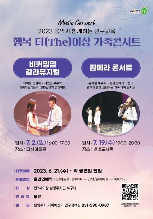 [한국뉴스타임=편집국] 남양주시는 저출산·고령화 등 인구문제에 대한 심각성을 이해하고, 지속가능한 사회 조성 및 가족의 건강성 증대 방안을 모색하기 위해'2023 음악과 함께하는 인구교육 행복 더(The) 이상 가족콘서트'를 개최한다고 22일 밝혔다.