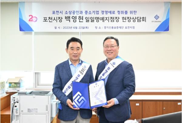 [한국뉴스타임=편집국] 백영현 포천시장은 지난 22일 경기신용보증재단 포천지점을 방문해 기업애로를 청취하고, 일일명예지점장으로 현장상담을 진행했다.