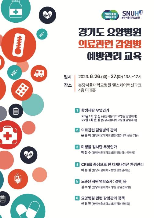 [한국뉴스타임=편집국] 경기도와 분당서울대학교병원이 6월 26일과 27일 분당서울대학교병원에서 도내 307개 요양병원 감염관리 담당자 등 간호사를 대상으로 병원 내 의료 관련 감염병 예방 교육을 실시한다.