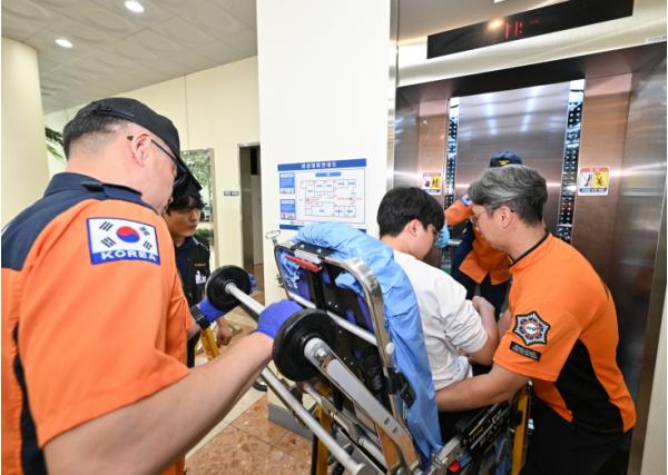 이어진 실제 훈련은 노후된 승강기 부품으로 인한 승강기 정지 상황을 가정하여 이용 고객이 갇혀 비상통화 버튼을 눌러 승강기 사고 상황을 알리고, 119 구조대 및 유지관리 업체에서 신속 출동해 이용객을 구조하는 순으로 훈련을 진행했다.