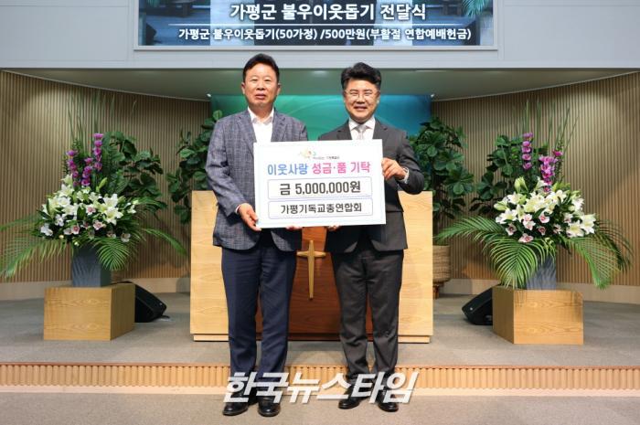 [한국뉴스타임=보도국] 지난 25일 가평기독교총연합회(대표 장익봉 목사)’는 청평장로교회에서 열린 6.25 구국기도회 현장에서 관내 저소득 가구 아동 및 청소년들과 따뜻한 온정을 나누기 위해 부활절 연합 예배 헌금 500만원을 이웃돕기 성금으로 군에 기탁하여 전달식을 가졌다.