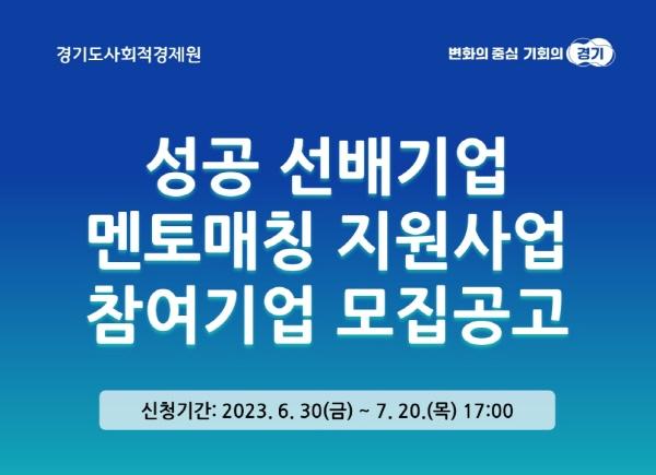 [한국뉴스타임=편집국] 경기도사회적경제원은 ‘2023년 성공 선배기업 멘토매칭 지원사업’에 참여할 사회적경제기업을 오는 7월 20일까지 모집한다.