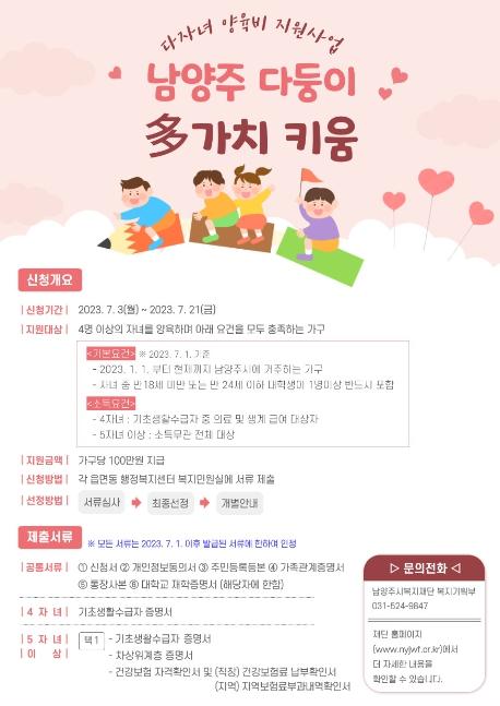 [한국뉴스타임=편집국] 남양주시복지재단은 4자녀 이상 다자녀 가정의 경제적 부담을 경감하고 출산 장려 분위기를 조성하기 위해 ‘2023년 하반기 다둥이 多가치 키움 사업’을 실시한다.