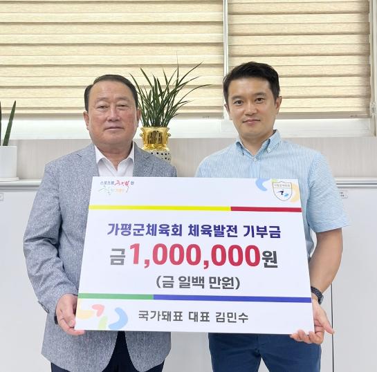 [한국뉴스타임=편집국] 가평군체육회는 관내 외식업체인 국가돼표로부터 유소년 체육발전을 위한 지정기부금 100만원을 기부받았다고 밝혔다.