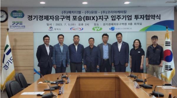 경기경제청은 5일 오후 2시 8층 회의실에서 ㈜에치디엘, ㈜유원, ㈜코리아케미칼, 평택시와 평택 포승(BIX)지구 산업시설 용지 입주를 위한 투자협약을 체결했다.