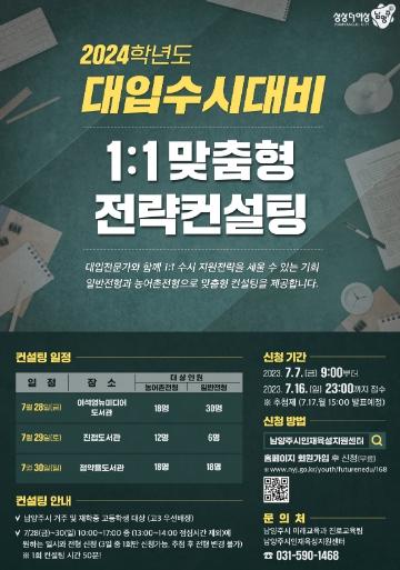 [한국뉴스타임=편집국] 남양주시는 오는 7월 28일, 29일, 30일 3일에 걸쳐‘2024학년도 대입 수시전형 대비 1:1 맞춤형 전략컨설팅’을 개최한다고 5일 밝혔다.