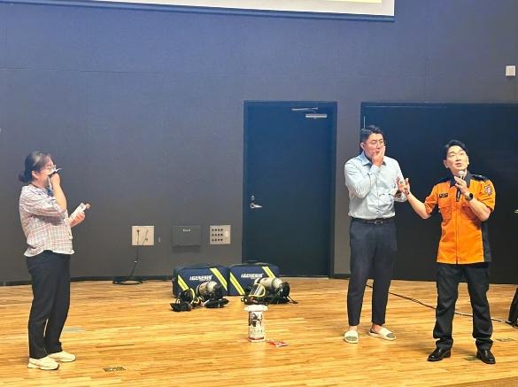 피난 훈련 후에는 현장경험이 풍부한 소방서 소속 전문강사가 청사 내 화재 발생 시 피난 요령을 중심으로 화재 신고와 초기소화 등에 대한 전문적인 교육과 실습을 실시했다. 전문 강사는 경기도 소방 분야 담당자와 함께 교육 전 청사를 직접 방문해 청사 내 소방시설과 피난 경로를 직접 파악한 뒤 신청사 특성에 맞는 교육을 준비했다.