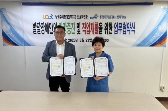 [한국뉴스타임=편집국] 남양주시장애인복지관 보호작업장과 남양주 현대병원은 지난달 23일 발달장애인의 건강증진 및 직업재활을 위한 업무 협약을 체결했다.