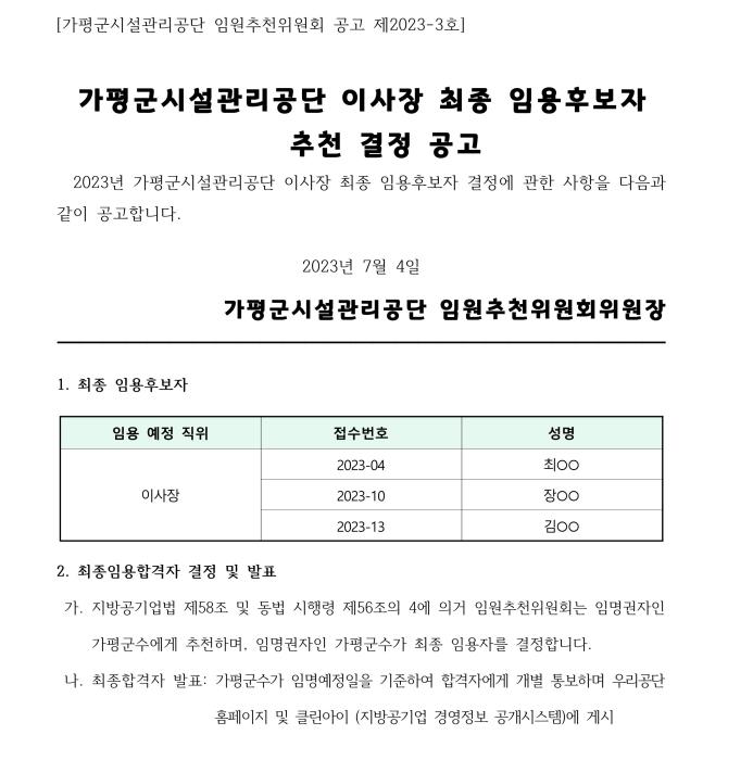 지난 4일 가평군시설관리공단 임원추천위원회는 1차 서류심사에 합격한 7명 후보의 면접심사를 실시하고 3명의 최종후보를 선정 하였고 서태원 가평군수에게 공식 추천하였다.