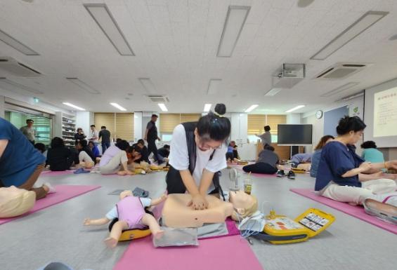 이날 교육은 2부로 나눠 진행됐으며, 1부에서는 남양주시 자율방재단장이 강의를 맡아 물놀이 사고 등으로 인한 응급상황 발생 시 심정지 골든타임 안에 조치할 수 있는 흉부 압박 및 제세동기 작동 방법 등 심폐소생술에 대한 교육을 진행했다.