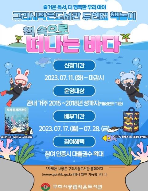 [한국뉴스타임=편집국] 구리시 공립작은도서관은 오는 7월 17일부터 7월 28일까지 ‘책 속으로 떠나는 바다’라는 주제로, 2023년 두 번째 책놀이 키트를 선착순 무료 배부한다.