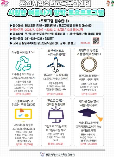 참가 대상은 포천시 관내 초등학생 1학년부터 고등학교 3학년까지이며 7월 12일부터 18일까지 포천시청소년교육문화센터 홈페이지 온라인으로 선착순 모집한다.