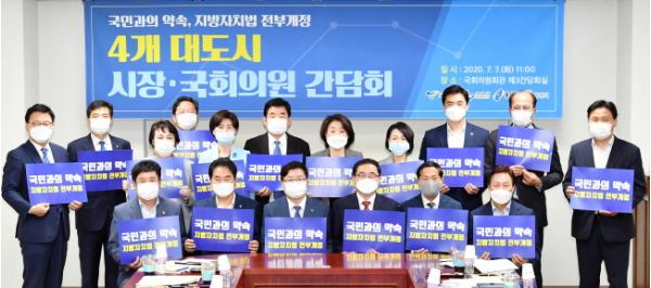 4개 대도시 시장은 “지방자치법 전부개정은 지방정부의 자율성을 확대하고, 중앙과 지방의 관계를 ‘협력적 동반자’ 관계로 전환하는 ‘자치와 분권’ 실현 방안”이라며 “지방자치법 전부개정안을 21대 국회 우선 처리 법안으로 지정해 달라”고 건의했다.