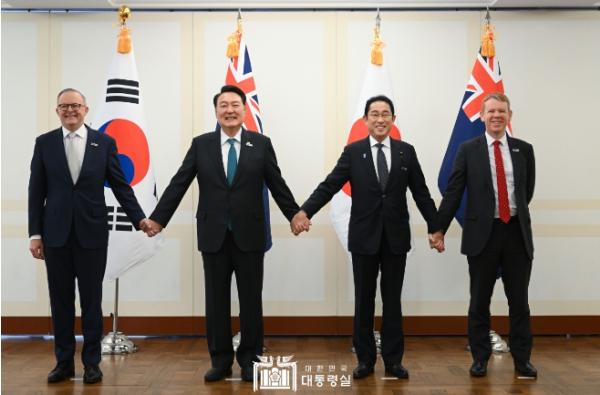 각국 정상들은 작년 첫 AP4 정상회동 이후 인태 지역의 자유, 평화, 번영과 규범기반 국제질서 강화를 위해 한국, 일본, 호주, 뉴질랜드 4개국이 상호간 소통과 협력을 강화해 온 것을 평가했다.