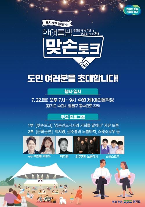 이번 맞손토크는 김동연 경기도지사가 취임 때와 같은 마음으로 도민의 이야기를 낮은 자세로 경청하고 소통하기 위해 마련됐다. 7월 22일 오후 7시 수원제1야외음악당에서 열린다.