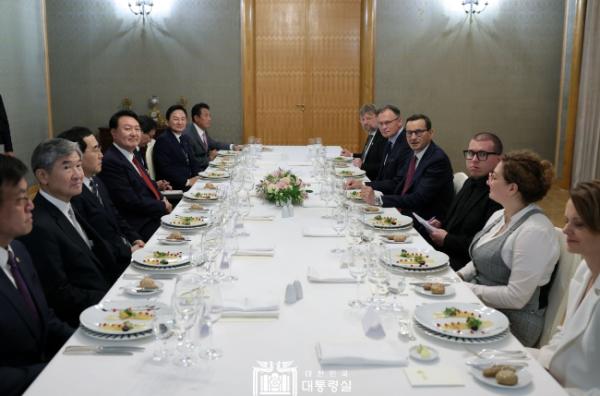 [한국뉴스타임=편집국] 윤석열 대통령은 현지시간 7월13일오후 '마테우슈 모라비에츠키(Mateusz Morawiecki)' 총리와 오찬을 갖고, 한-폴 양국 간 교역·투자, 원전, 방산, 인프라 분야의 실질협력 확대와 문화, 인적교류 증진 방안에 대해 협의했다.