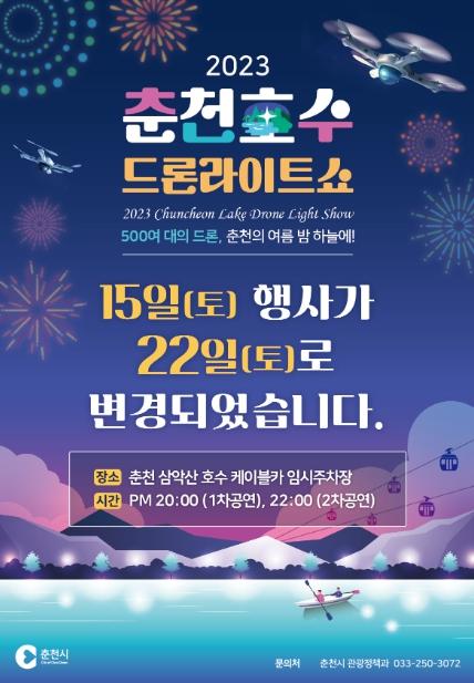 또 춘천호수 드론 라이트쇼와 함께 2023 버스킹 시티 춘천, 호수드론 프리마켓, 영화상영(코코) 등도 즐길 수 있다.