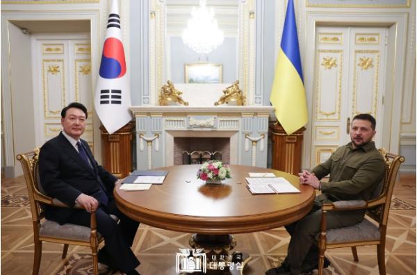 대통령은 전사자 추모의 벽을 찾아 헌화한 후 젤렌스키 대통령과 정상회담을 가졌다.