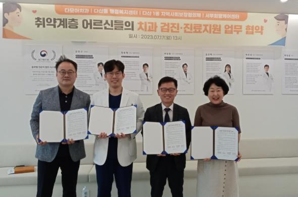 [한국뉴스타임=편집국] 남양주시 다산행정복지센터는 지난 17일 다모아치과의원 다산점, 다산1동 지역사회보장협의체, 서부희망케어센터와 다산동 취약계층의 건강한 삶을 위한 '치과 검진 및 진료 지원에 관한 업무협약'을 체결했다.