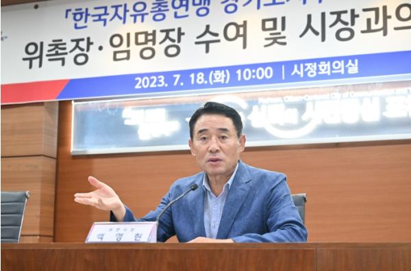 백영현 포천시장은 “유구한 역사와 전통에 빛나는 한국자유총연맹의 포천시지회 재건을 진심으로 축하드린다. 최근 드론작전사령부 창설 및 6군단 부지반환 문제와 더불어 역세권 개발 및 블루웨이 조성사업, 청성산 종합개발 등 도시발전을 위한 중요 국책 · 시책 사업을 펼치고 있는 바, 지역사회 내 분열을 통합하고 새로운 포천시 성장을 위한 원동력을 확보할 수 있도록 노력해주시길 바란다”고 전했다.