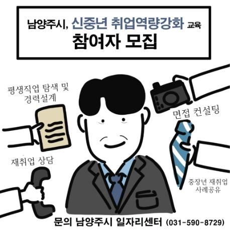[한국뉴스타임=편집국] 남양주시는 퇴직 후 재취업을 준비하는 중장년층을 대상으로‘신중년 취업역량강화 교육’을 오는 8월 9일, 10일 이틀간 운영한다.