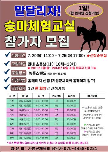 [한국뉴스타임=편집국] 가평군체육회가 말달리자! 승마체험교실 참가자모집을 시작한다. 가평군 관내 초등학생 3~6학년을 대상으로, 참가비 만원으로 말도 타고 말과 교감할 수 있는 기회를 제공한다.