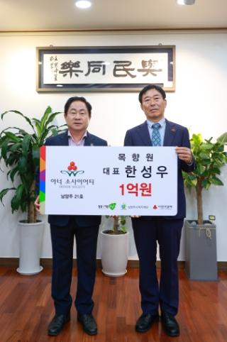 [한국뉴스타임=편집국] 남양주시 별내동 소재 목향원 한성우 대표는 19일 지역 내 어려운 이웃을 돕기 위해 1억 원 기부를 약정하며 ‘아너 소사이어티’에 가입했다.