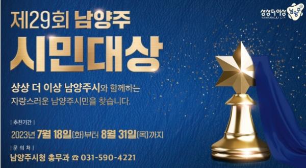 [한국뉴스타임=편집국] 남양주시는 상상 더 이상 남양주시의 발전과 명예를 위해 공헌한 ‘제29회 남양주시민대상’후보자를 오는 8월 31일까지 추천받는다고 20일 밝혔다.